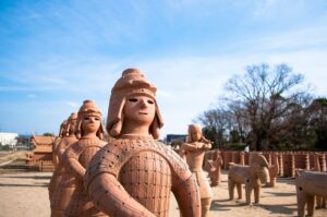 今城塚古墳の復元埴輪群は、団体での記念撮影に最適な場所です。